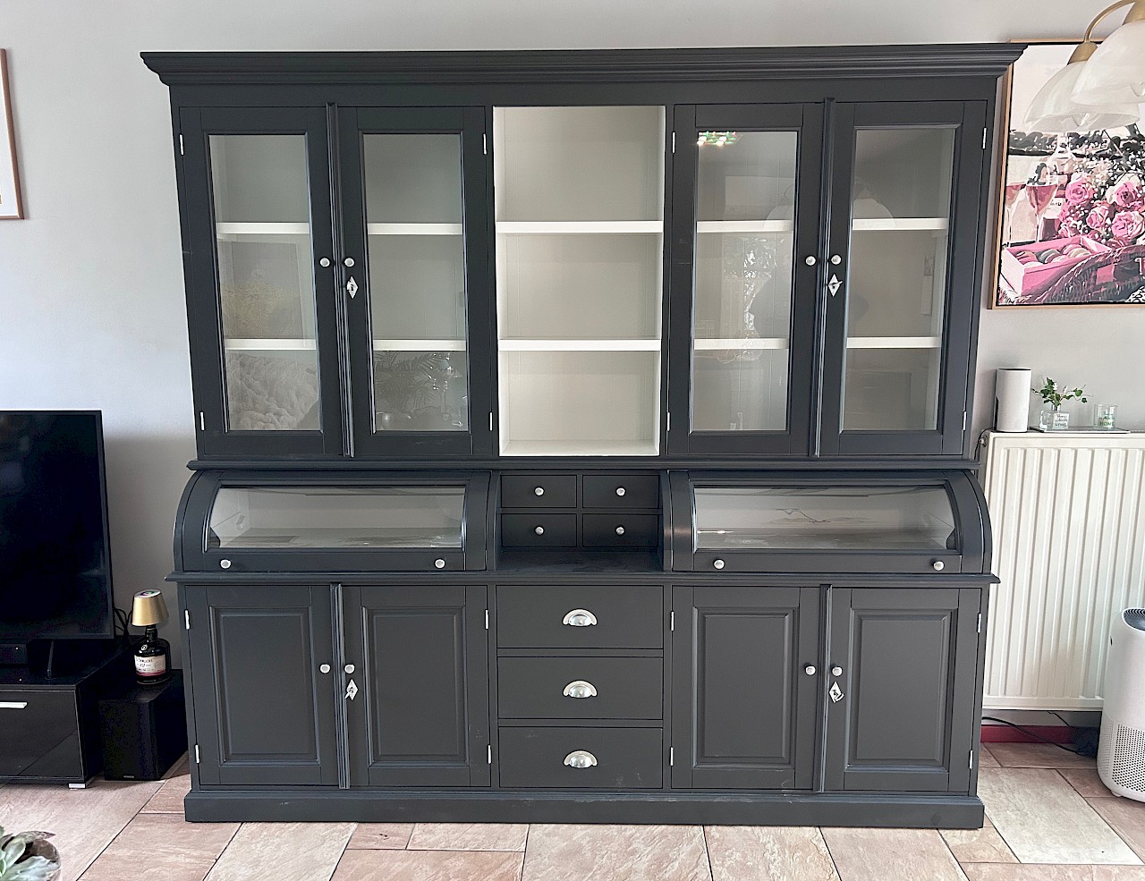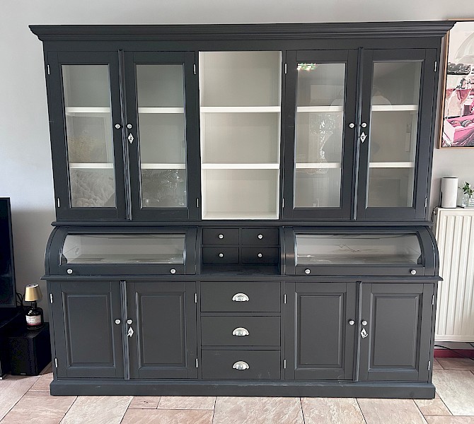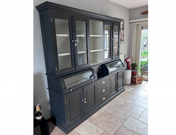 Deze prachtige buffetkast Bastiaan 230cm heeft een geweldige uitstraling. Uiteraard bestaat de kast uit 2 delen, het bovenste gedeelte valt achter een sierlijst in het onderste gedeelte. De afwerking is glad gespoten, en hoogwaardige kwaliteit: softclosing op de lades, en afsluitbare deuren!