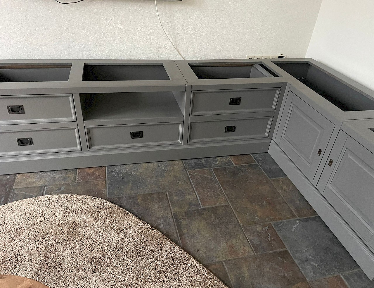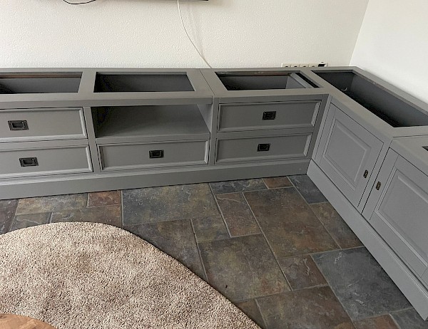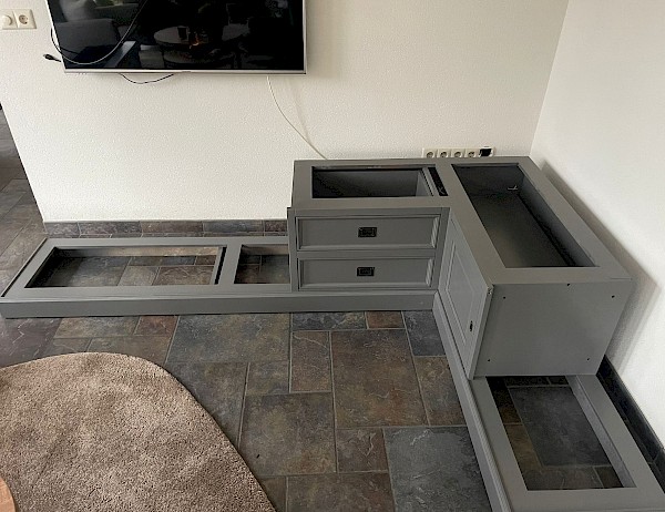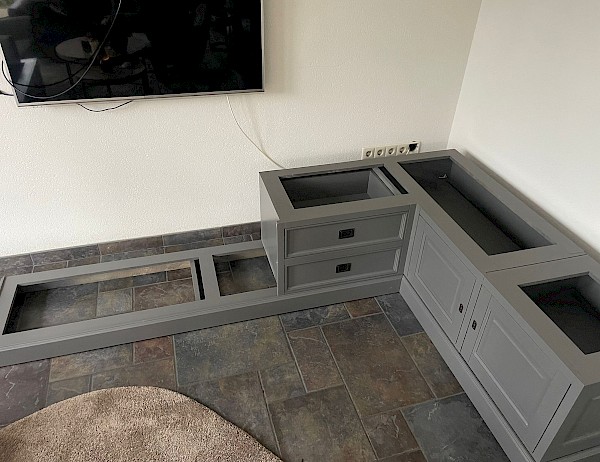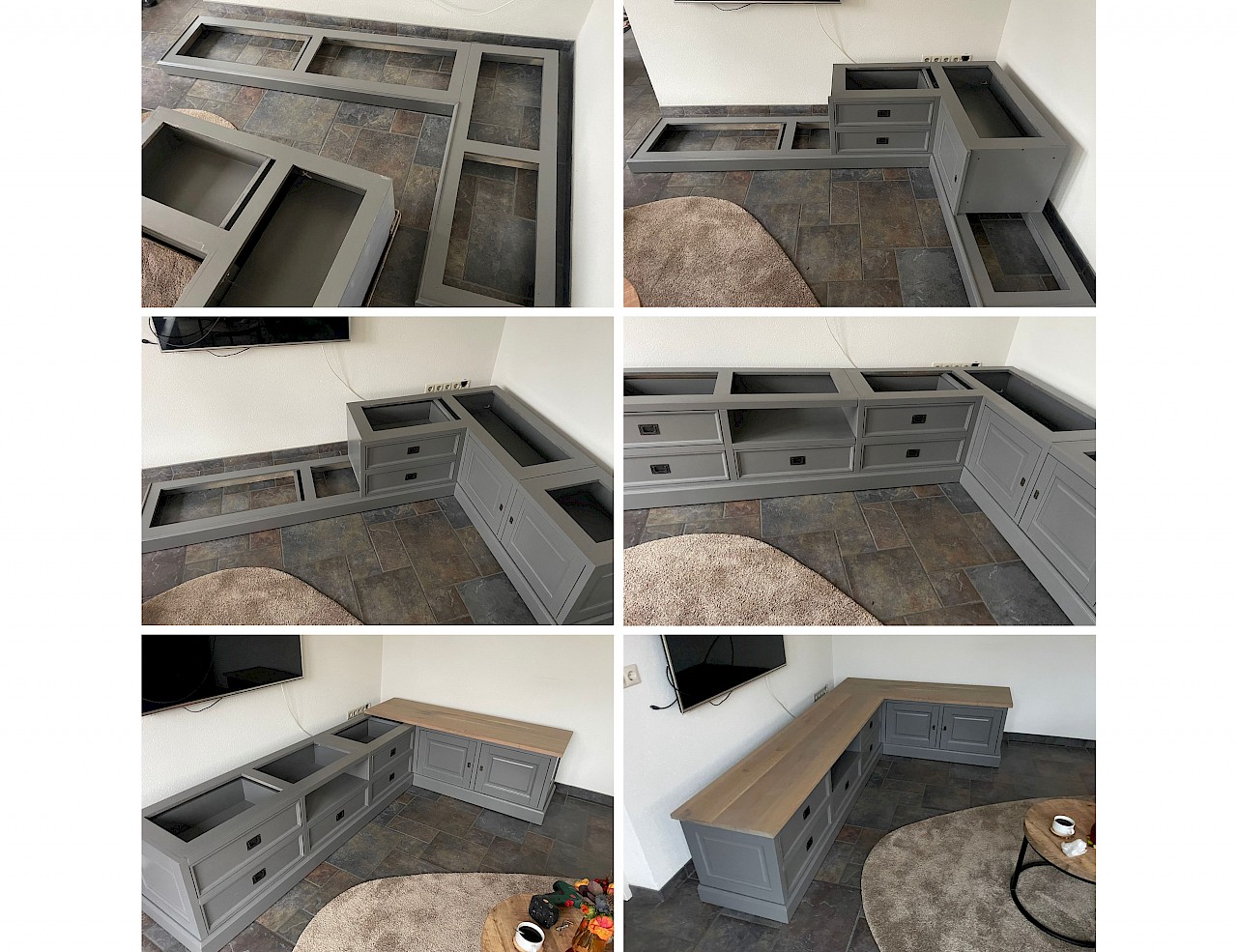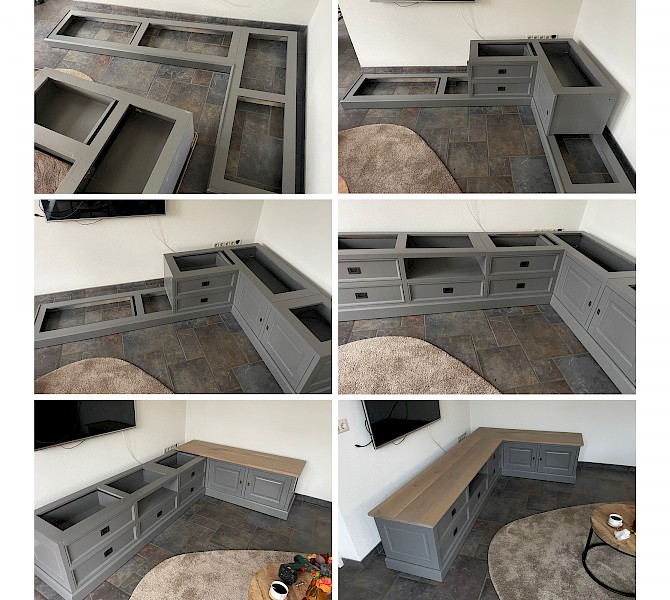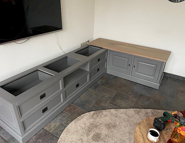 Dit TVmeubel in hoekopstelling is specifiek op maat voor deze klant in deze hoek gemaakt. De kastdelen zijn, zoals u op de foto's kunt zien, los van elkaar geproduceerd, zodat eea ook een naadloos geheel is geworden, zelfs het kastje in de hoek is functioneel gemaakt.