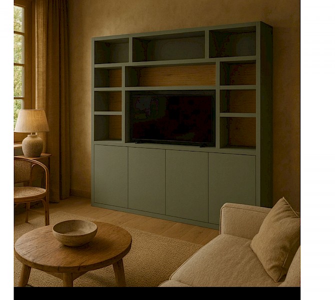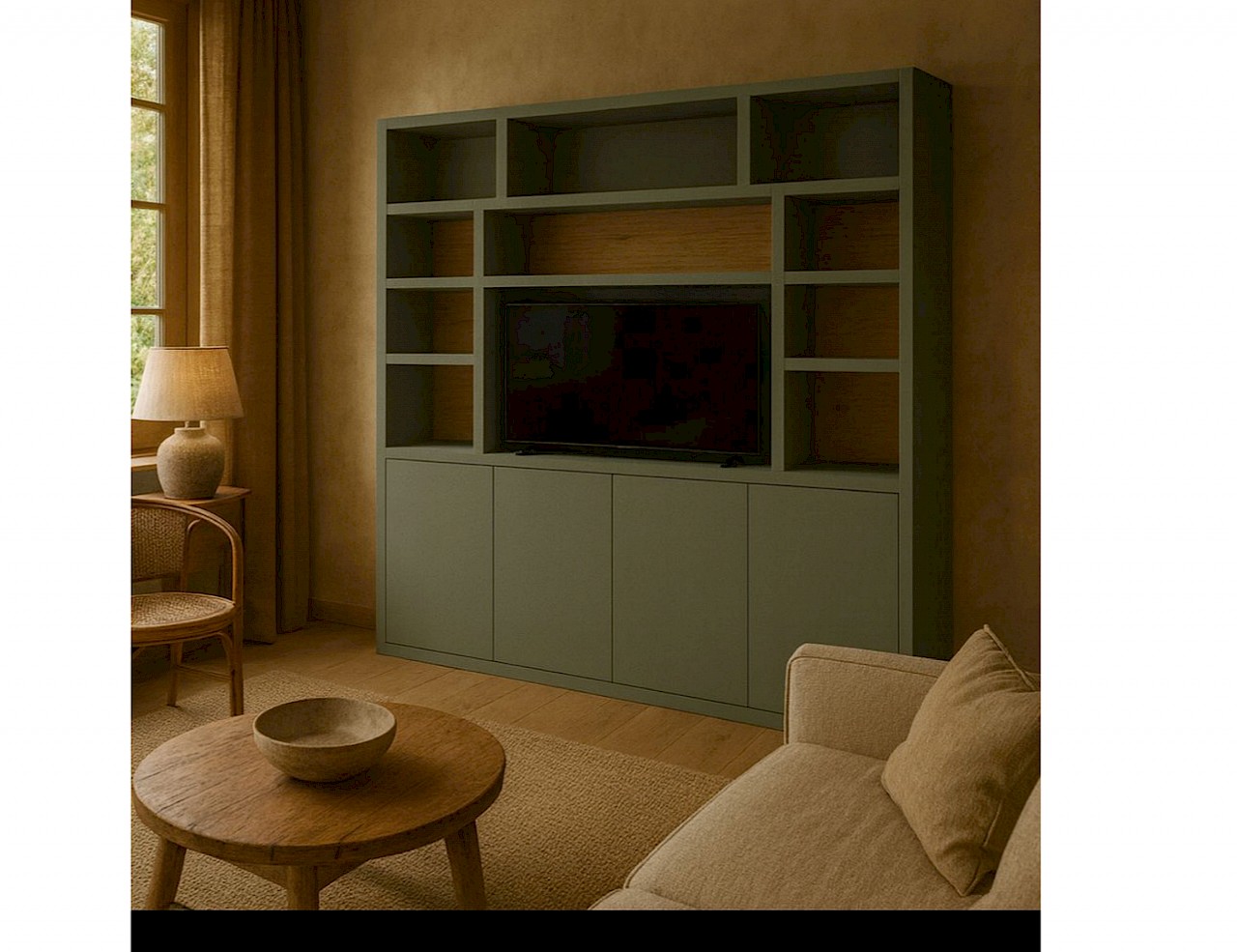 Bovenin heeft de kast 11 open vakken, speels verdeeld rondom het centrale tv-vak. Hierdoor creëer je een stijlvolle en overzichtelijke tv-opstelling, terwijl je ook volop ruimte hebt om boeken, kunst en decoratie een mooie plek te geven.