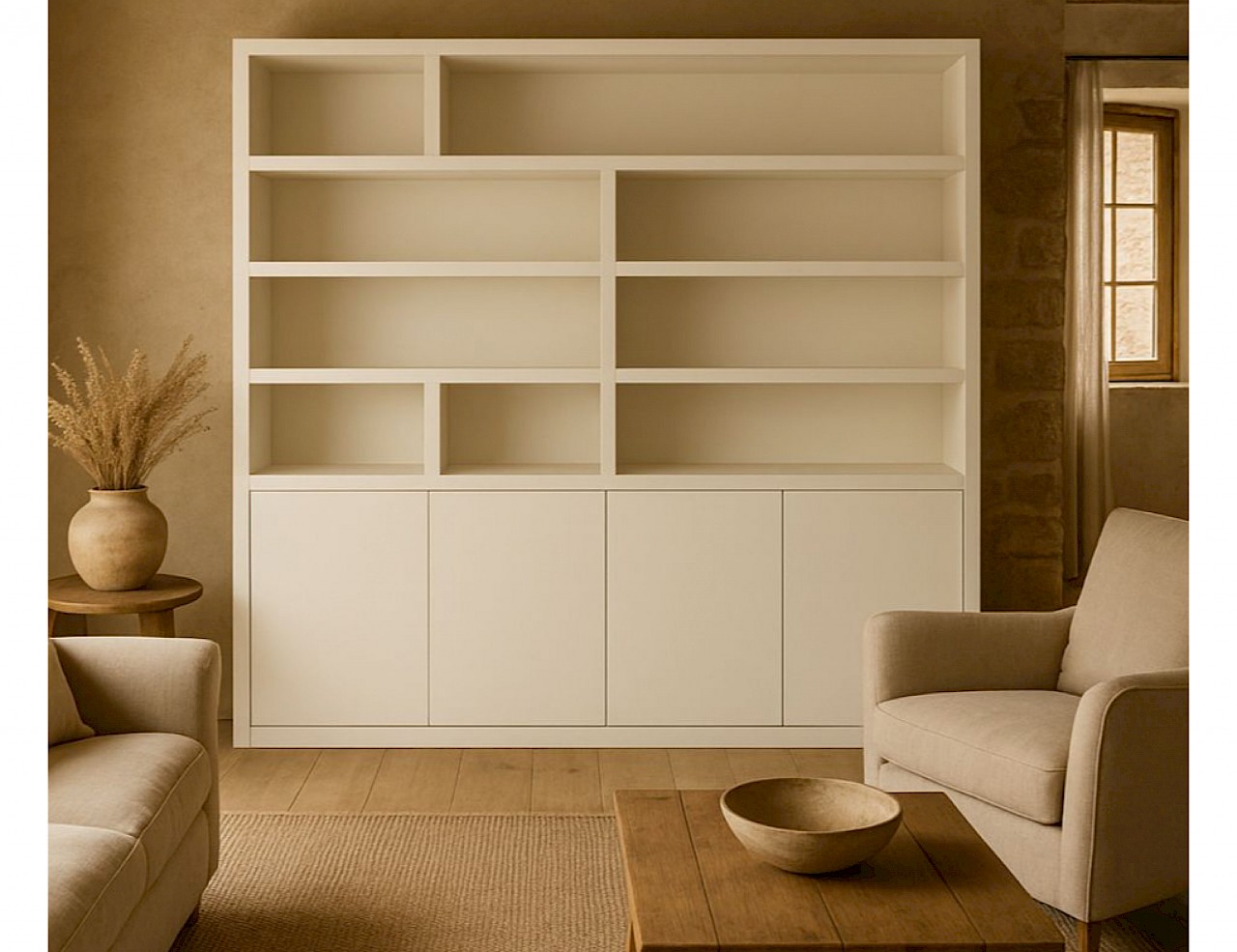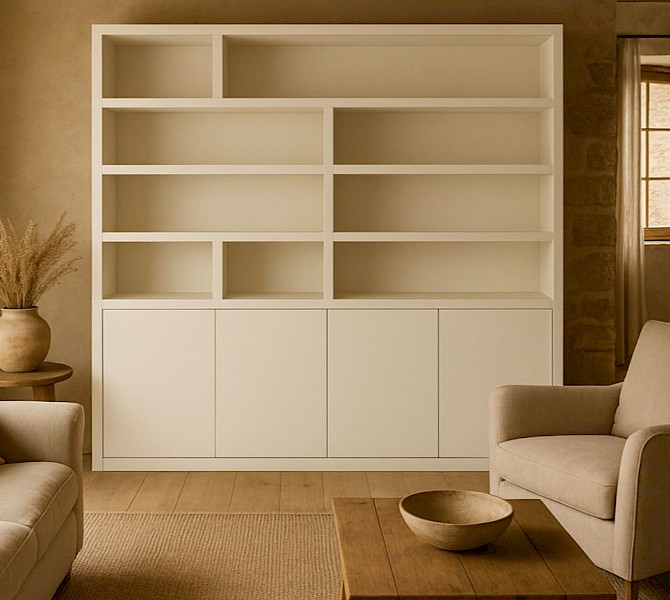 Deze vakkenkast heeft zowel gesloten ruimtes als open vakken. De onderkast beschikt de kast over 4 push-to-open deuren, die toegang geven tot een ruime, dichte opbergsectie. Dankzij het greeploze systeem blijft het ontwerp strak en naadloos.